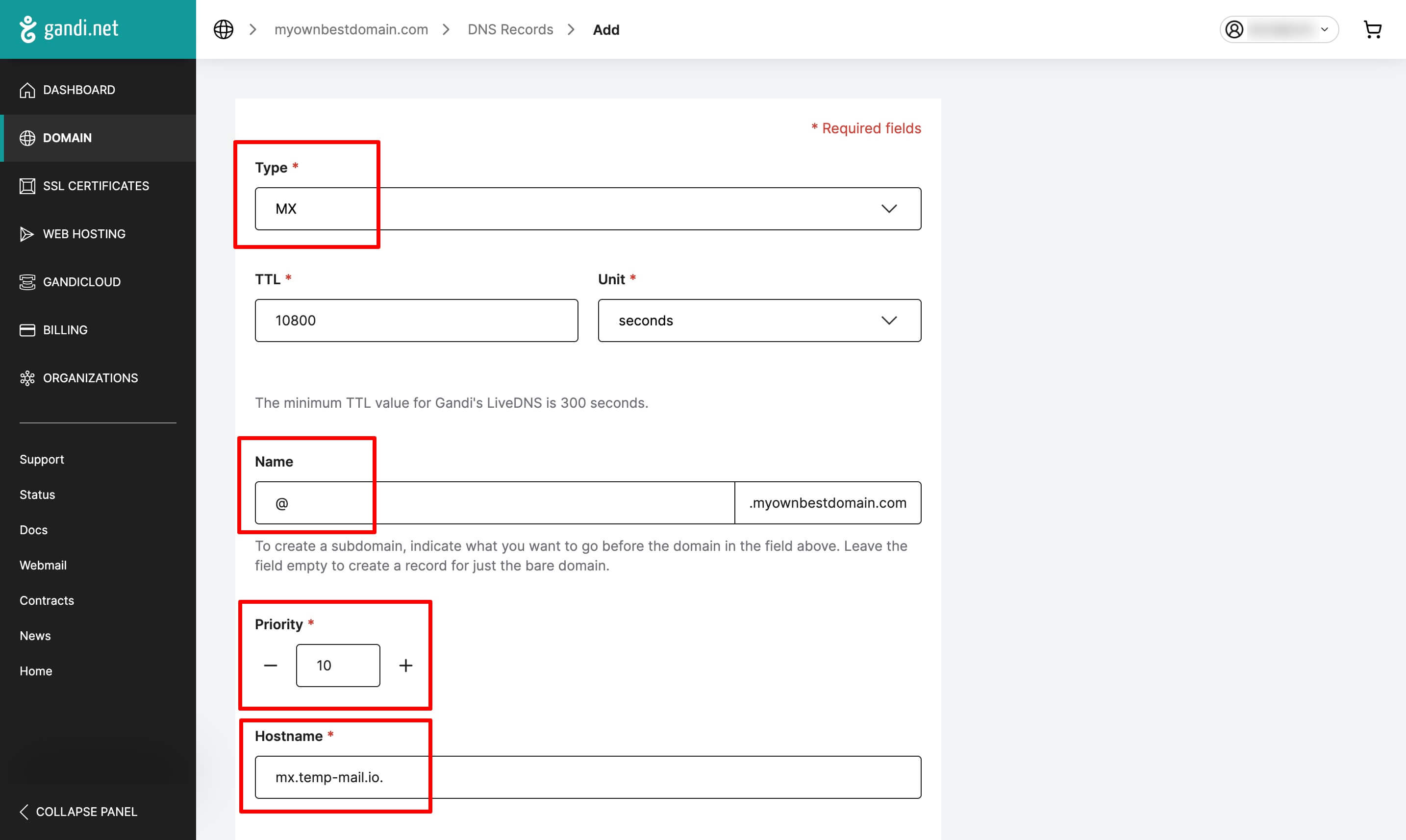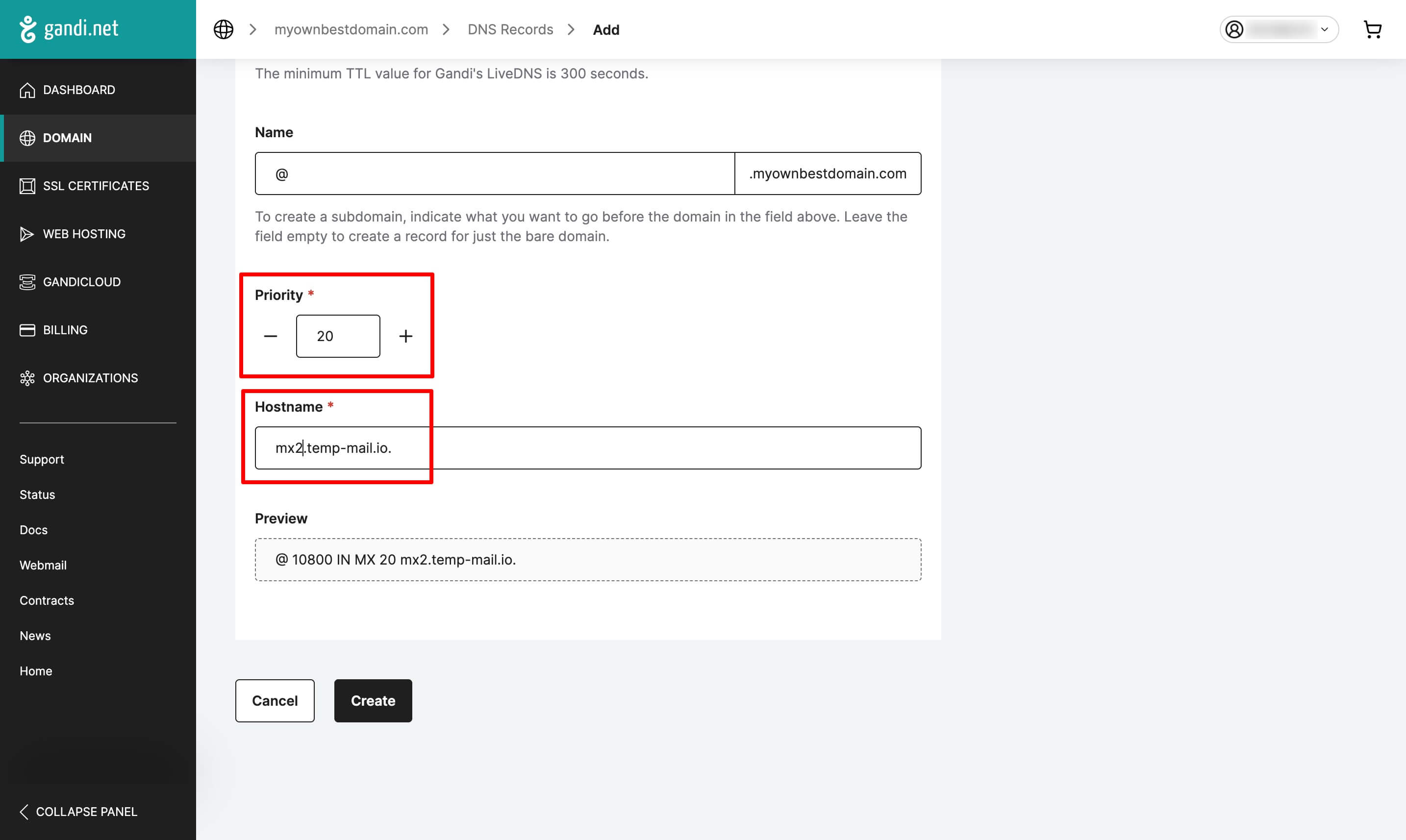 - Select "MX" record type, fill out the form and click on "Create" button.
